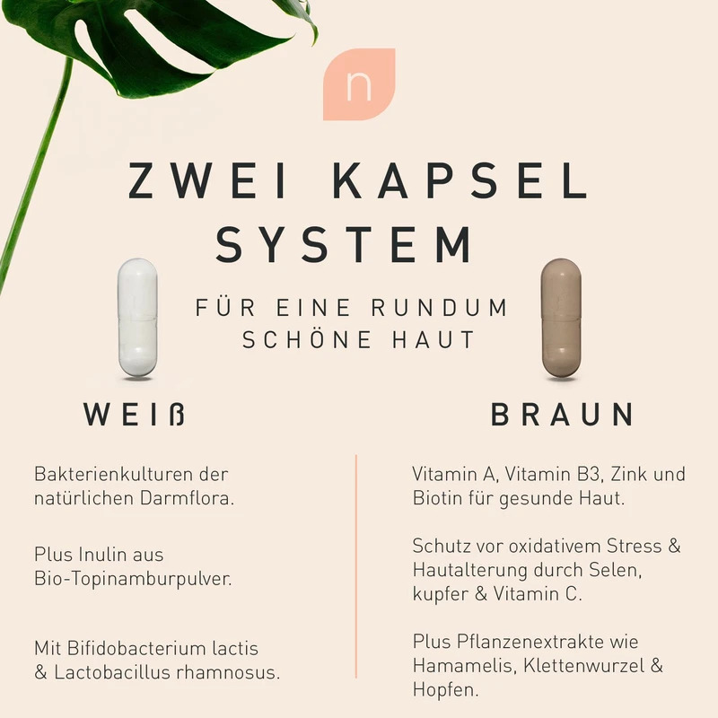 Mit dem Zwei-Kapsel-System versorgt nupure probaskin die Haut mit wichtigen Vitaminen und Spurenelementen.